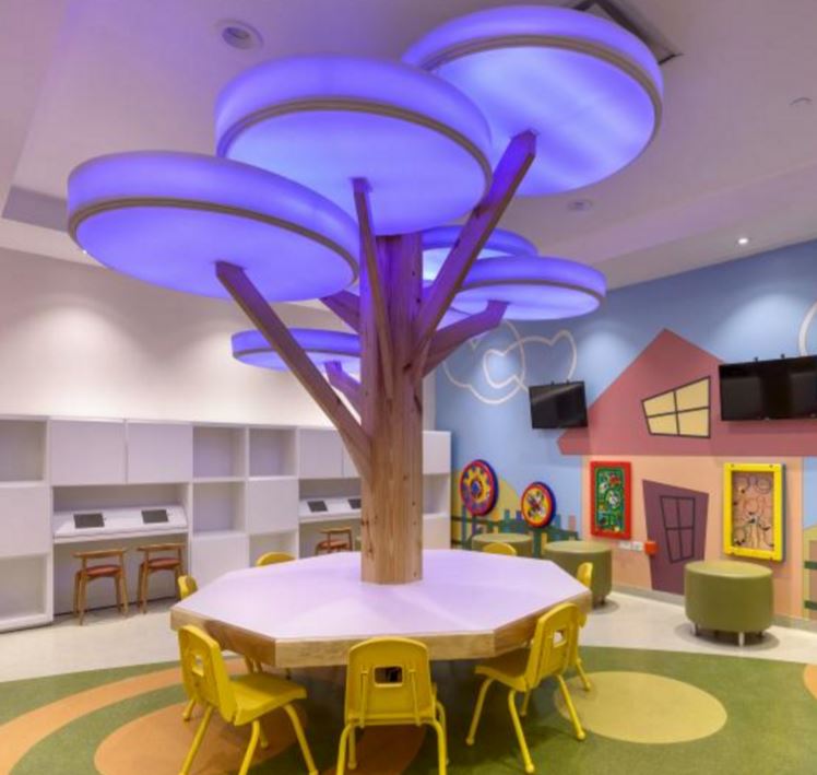 A tree was the actual inspiration for the healthcare design of The Cedimat Cardiovascular Center. On each floor there is representation of the trees throughout the seasons, so you can experience each season of the year while surrounded by birds and forest scenery. This kids area features waiting room wall toys available at SensoryEdge in the mounted wall toy collection
